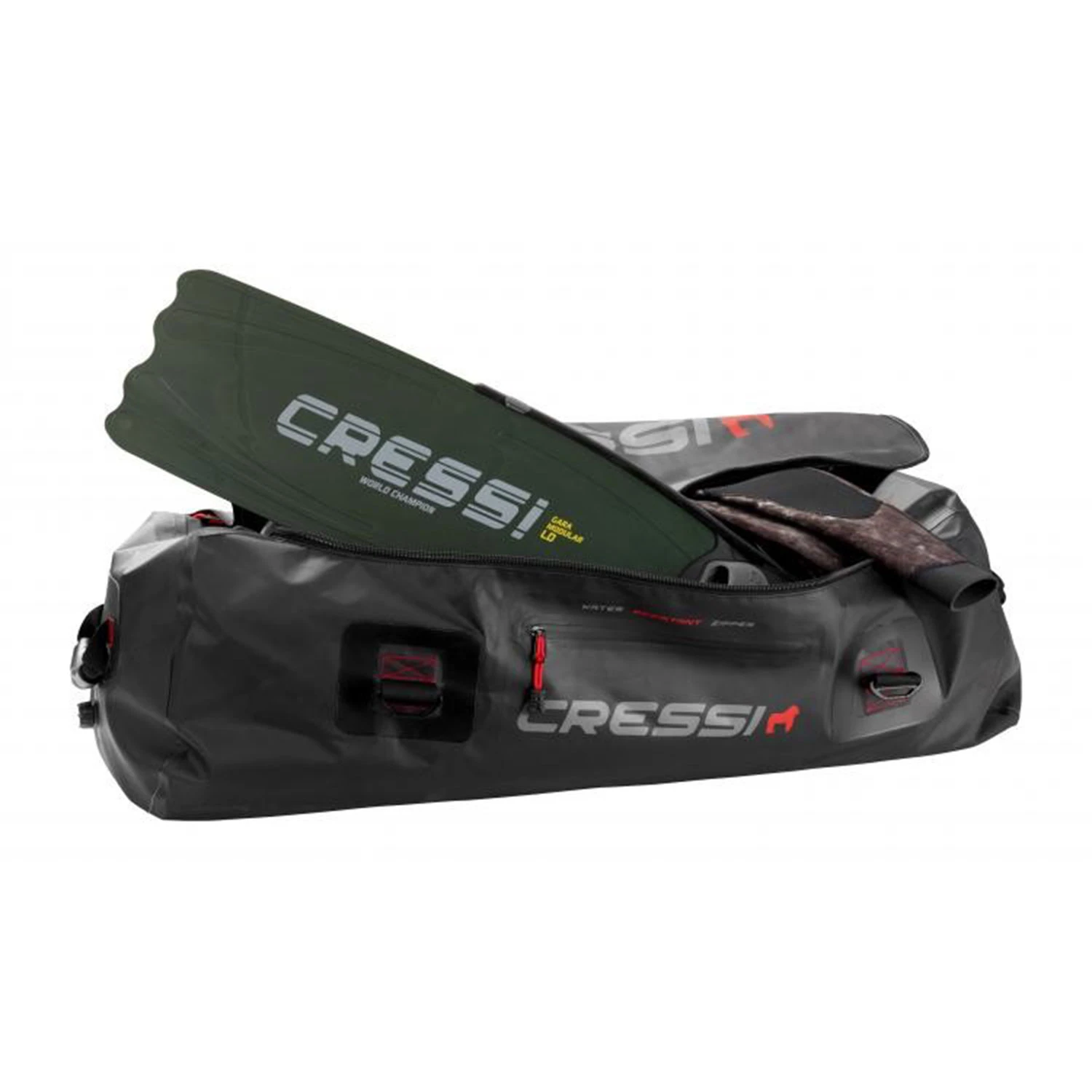 The bag is long enough to hold even the long free diving fins. It is made from a strong radio frequency (RF) welded seam PVC and is waterproof.